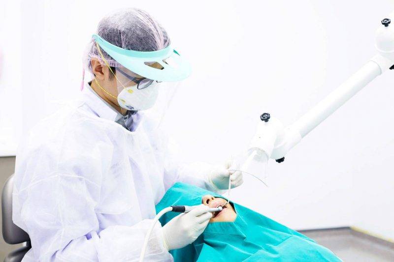 • มีการใช้แผ่นยางกันน้ำลายปิดทั้งปากยกเว้นซี่ที่ทำฟัน เพื่อลดการกระจายของเชื้อโรคต่าง ๆ ขณะทำฟัน