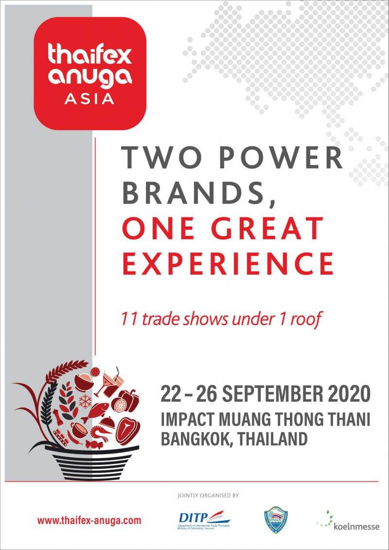 กรมส่งเสริมการค้าระหว่างประเทศ (DITP) หอการค้าไทย (TCC) และ โคโลญเมสเซ่ (KM) ผู้จัดงานแสดงสินค้าอาหารและเครื่องดื่ม THAIFEX – ANUGA ASIA เตรียมความพร้อมในการจัดงาน THAIFEX – ANUGA ASIA 2020 ในวันที่ 22-26 กันยายน 2563 ณ ศูนย์แสดงสินค้าและการประชุมอิมแพ็ค เมืองทองธานี เชิญชวนผู้สนใจร่วมเจรจาซื้อ-ขายสินค้าและบริการด้านอาหารและเครื่องดื่มที่จะจัดขึ้นอย่างครบครัน ภายใต้คอนเซ็ปต์ 11 เทรดโชว์ในที่เดียว ประกอบด้วย อาหารสำเร็จรูป ขนมและของขบเคี้ยว เครื่องดื่ม ผักผลไม้ อาหารทะเล อาหารแช่แข็ง ผลิตภัณฑ์เนื้อสัตว์ ข้าวและธัญพืช กาแฟและชา เทคโนโลยีอาหาร และบริการด้านอาหาร