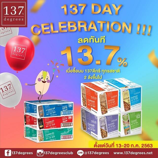 บริษัท ซิมเพิ้ล ฟู้ดส์ จำกัด ชวนฉลองวันสุขภาพดี 137 Day มอบส่วนลดพิเศษ สำหรับนม อัลมอนด์ นมวอลนัท หรือ นมพิสตาชิโอ แบรนด์ 137 ดีกรี รสชาติใด ขนาดก็ได้ ตั้งแต่ 2 ลัง ขึ้นไป ผ่านช่องทาง LINE หรือ Facebook รับส่วนลดทันที 13.7% ตั้งแต่วันที่ 13 – 20 กรกฏาคม 2563