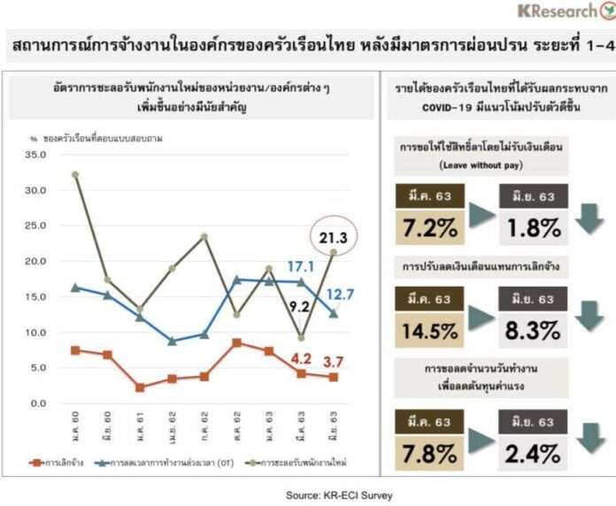 16 ก.ค.63/ศูนย์วิจัยกสิกรไทย แจ้งว่า ดัชนีภาวะเศรษฐกิจและการครองชีพของครัวเรือนไทย (KR-ECI) ในเดือนมิ.ย. 2563 อยู่ที่ระดับ 36.0 ทรงตัวใกล้เคียงกับเดือนพ.ค. 2563 ที่อยู่ในระดับ 36.1 แม้รายได้และการมีงานทำของครัวเรือนจะปรับตัวดีขึ้นจากเดือนก่อนหน้า แต่ในขณะเดียวกัน ครัวเรือนก็มีรายจ่าย (ไม่รวมหนี้) เพิ่มขึ้นจากระดับราคาสินค้าที่สูงขึ้นและครัวเรือนบางส่วนมีรายจ่ายเพิ่มเติมเกี่ยวกับการศึกษาของบุตรหลาน