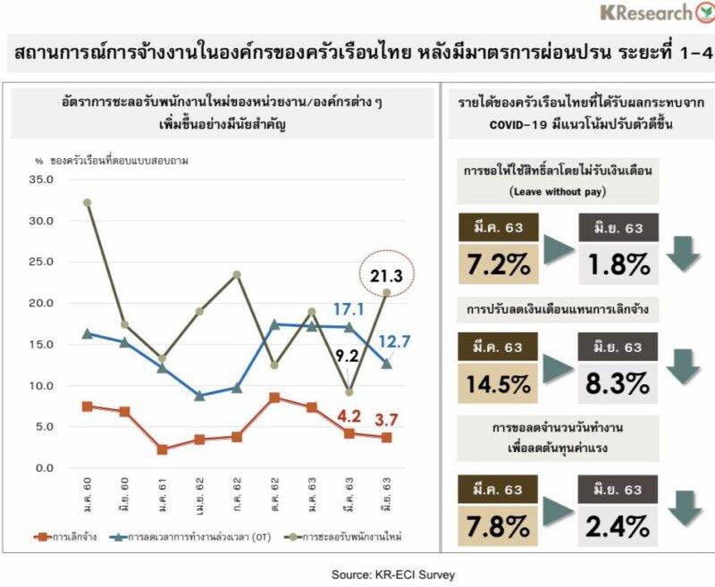 ดัชนีภาวะเศรษฐกิจและการครองชีพของครัวเรือนไทยอีก 3 เดือนข้างหน้า (3-month Expected KR-ECI) อยู่ที่ระดับ 37.4 ในการสำรวจช่วงเดือนมิ.ย. 2563 ปรับตัวดีขึ้นจากระดับ 35.9 ในการสำรวจช่วงเดือนพ.ค. 2563 นับเป็นครั้งแรกในรอบ 7 เดือน ที่ดัชนีภาวะเศรษฐกิจฯ ในช่วง 3 เดือนข้างหน้า อยู่ในระดับสูงกว่าดัชนีภาวะเศรษฐกิจฯ ในปัจจุบัน ชี้ให้เห็นว่า ครัวเรือนไทยมองภาวะเศรษฐกิจและการครองชีพของตนเองได้ผ่านจุดที่ย่ำแย่ที่สุดไปแล้ว