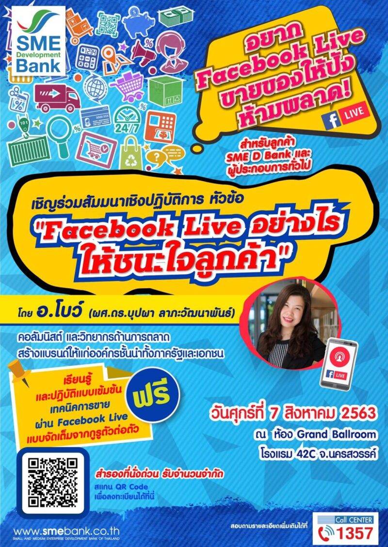 ธนาคารพัฒนาวิสาหกิจขนาดกลางและขนาดย่อมแห่งประเทศไทย (ธพว.) หรือ SME D Bank จัดสัมมนาเชิงปฏิบัติการ หัวข้อ “Facebook Live อย่างไร ให้ชนะใจลูกค้า” ในวันศุกร์ที่ 7 สิงหาคม 2563 เวลา 08.30-16.00 น. ณ ห้อง Grand Ballroom โรงแรม 42C จังหวัดนครสวรรค์