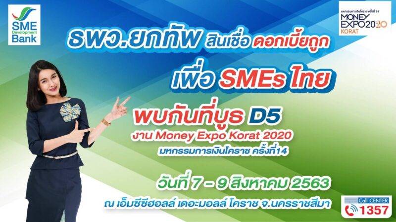 ธนาคารพัฒนาวิสาหกิจขนาดกลางและขนาดย่อมแห่งประเทศไทย (ธพว.) หรือ SME D Bank ยกขบวนผลิตภัณฑ์ทางการเงินเข้าร่วมงานมหกรรมการเงินโคราช ครั้งที่ 14 จังหวัดนครราชสีมา หรือ Money Expo Korat 2020 ระหว่างวันที่ 7-9 สิงหาคม 2563 ณ เอ็มซีซี ฮอลล์ ชั้น 3 ห้างสรรพสินค้าเดอะมอลล์ โคราช บูธ D5