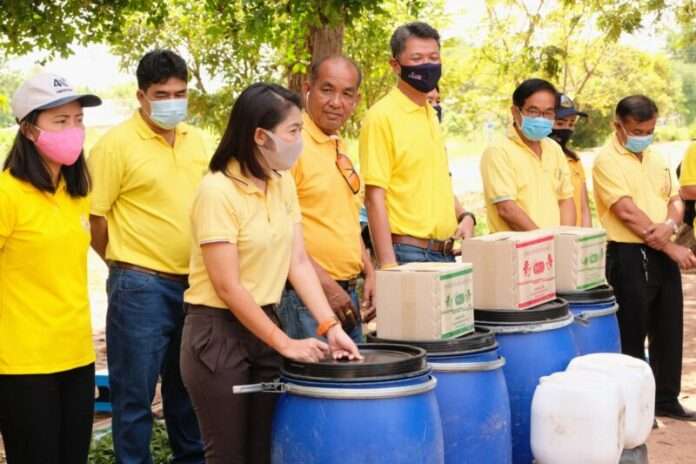 ที่โครงการฟาร์มตัวอย่างต้านภัยโควิต19 บ้านกำพี้ หมู่ทื่ 1 ตำบลกำพี้ อำเภอบรบือ มหาสารคาม นายชูเกียรติ คำโสภา ผอ.สถานพัฒนาที่ดินมหาสารคาม นำสมาชิกที่เข้าร่วมโครงการฟาร์มตัวอย่างต้านภัยโควิต19 กระทรวงเกษตรและสหกรณ์ สาธิตการใช้สารเร่ง พด. 2 ผลิตปุ๋ยอินทรีย์น้ำ เป็นปุ๋ยอินทรีย์ในรูปของเหลว ซึ่งได้จากการย่อยสลายวัสดุเหลือใช้จากพืชหรือสัตว์ลักษณะสด อวบน้ำหรือมีความชื้นสูงโดยอาศัยกิจกรรมของจุลินทรีย์ทั้งในสภาพที่ไม่มีอากาศและมีอากาศ ได้ของเหลวสีน้ำตาล ประกอบด้วยฮอร์โมนหรือสารเสริมการเจริญเติบโตของพืช นอกจากนี้ ยังสาธิตการใช้สารเร่ง พด.7 ผลิตสารป้องกันแมลงศัตรูพืช เพื่อใช้ในการป้องกันแมลงระบาดในแปลงปลูกพืชของฟาร์มและเพื่อให้เกษตรกรนำความรู้ที่ได้ไปปรับใช้ในไร่นาของตนเองหลังเสร็จสิ้นโครงการ