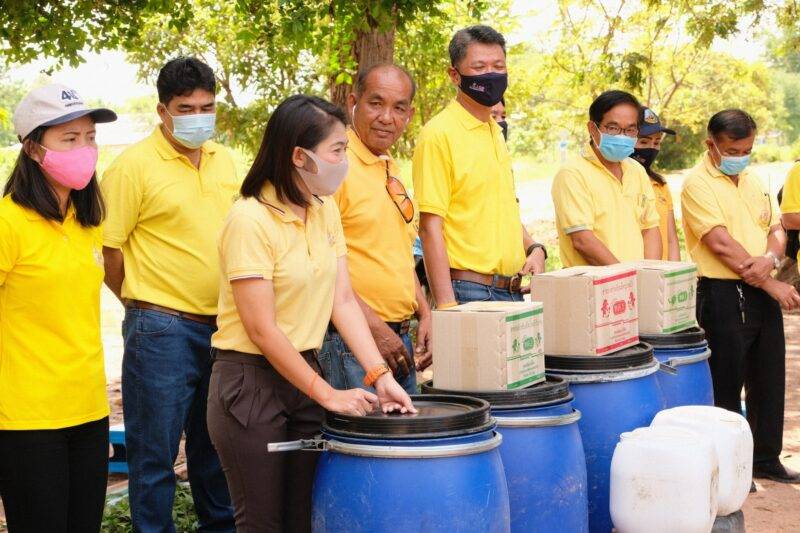 นายชูเกียรติ คำโสภา ผู้อำนวยการสถานพัฒนาที่ดินมหาสารคาม กล่าวว่า สถานีได้ร่วมกับฟาร์มตัวอย่างต้านภัยวิด 19 ร่วมกับสมาชิกโครงการ เพื่อให้ความรู้ในการปรับปรุงบำรุงดินจากการใช้สารเร่ง พด.2 และสารเร่ง พด.7 ซึ่งเป็น เชื้อจุลินทรีย์ที่มีคุณสมบัติในการเพิ่มประสิทธิภาพการหมักและย่อยสลายวัสดุเหลือใช้จากพืชสมุนไพร ในสภาพที่ไม่มีออกซิเจน เพื่อผลิตสารป้องกันแมลงศัตรูพืช อาทิ เพลี้ยชนิดต่าง ๆ หนอนเจาะผล และลำต้น หนอนใยผัก หนอนชอนใบ หนอนคืบ หนอนกระทู้ หนอนกอไรแดง และแมลงหวี่ เป็นต้น