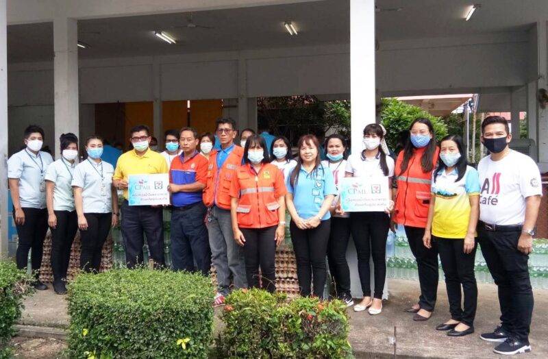 นายสุรมิตร มิกขุนทด (ที่ 4 จากซ้าย) รองผู้จัดการทั่วไป บมจ.ซีพี ออลล์ ผู้บริหาร ออลล์ ออนไลน์ และ เซเว่น อีเลฟเว่น เป็นตัวแทนซีพี ออลล์นำทีมชมรมจิตสาธารณะ ซีพี ออลล์ พร้อมด้วยพนักงานเซเว่น อีเลฟเว่น มอบน้ำดื่ม พร้อมไข่ไก่ ให้กับนายบุญลือ แก้วเหม (ที่ 5 จากซ้าย) หัวหน้าสำนักงานป้องกันและบรรเทาสาธารณภัย จังหวัดสุโขทัย เพื่อนำไปช่วยเหลือบรรเทาความเดือดร้อนและเป็นขวัญกำลังใจให้ผู้ประสบอุทกภัยในเบื้องต้น ณ ศาลากลาง จังหวัดสุโขทัย เมื่อเร็วๆ นี้