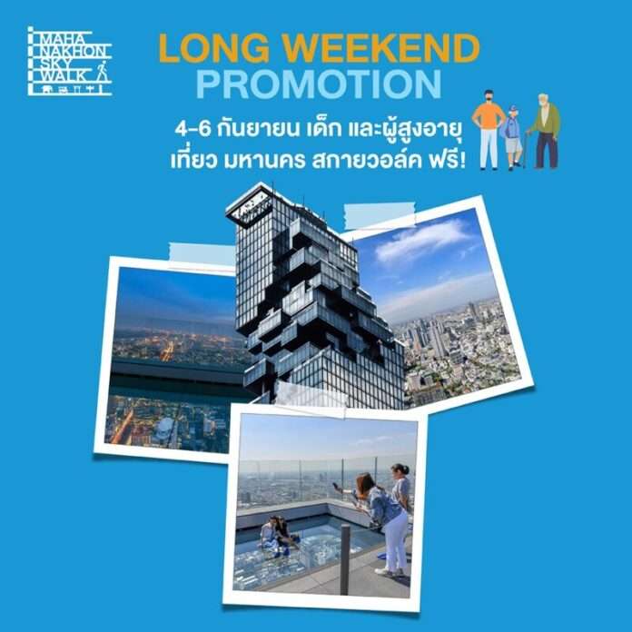กรุงเทพฯ / 1 กันยายน 2563 – วันหยุดยาวที่จะถึงนี้ คิง เพาเวอร์ มหานคร ชวนทุกท่านมาท่องเที่ยวชมความงดงามของกรุงเทพฯ กันที่มหานคร สกายวอล์ค จุดชมวิวชั้นดาดฟ้าที่สูงที่สุดในประเทศไทย พร้อมโปรโมชั่นพิเศษในช่วงวันหยุดยาวระหว่างวันที่ 4 – 6 กันยายนนี้ เด็ก (อายุต่ำกว่า 18 ปี) และผู้สูงอายุ (อายุ 60 ปีขึนไป) ขึ้นชมมหานคร สกายวอล์ค ฟรี* เมื่อทำการซื้อบัตรเข้าชมมหานคร สกายวอล์ค (ผู้ใหญ่) ราคา 880 บาท อย่างน้อย 1 ใบ
