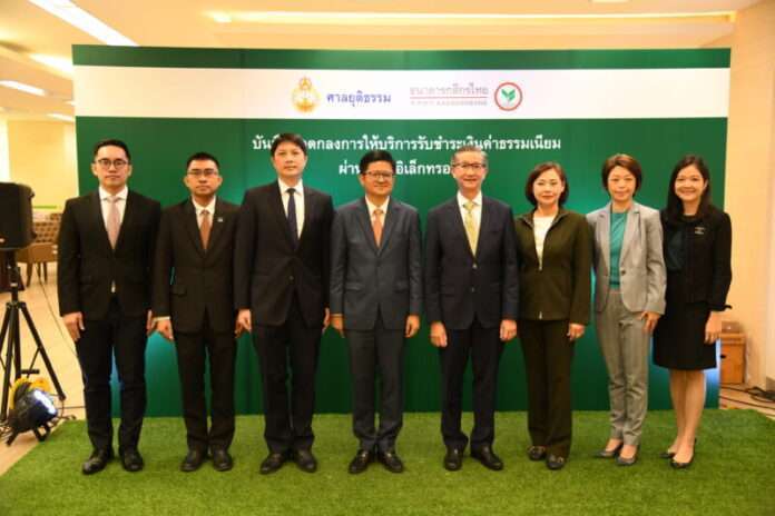 มาสนับสนุนการดำเนินงานของภาครัฐ เพิ่มความสะดวกในการชำระค่าธรรมเนียมและค่าใช้จ่ายอื่น ๆ ให้แก่คู่ความ โดยมี นายสราวุธ เบญจกุล เลขาธิการสำนักงานศาลยุติธรรม และนายศีลวัต สันติวิสัฎฐ์ รองกรรมการผู้จัดการอาวุโส บริษัท ธนาคารกสิกรไทย จำกัด (มหาชน) เป็นผู้แทนร่วมลงนามในบันทึกข้อตกลงดังกล่าว ณ ศูนย์วิทยบริการศาลยุติธรรม อาคารศาลอาญา ชั้น 6 ถนนรัชดาภิเษก กรุงเทพมหานคร