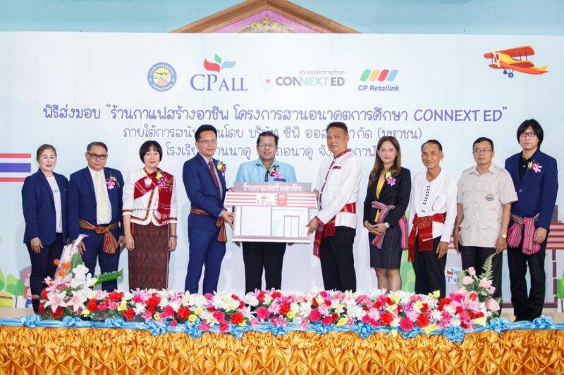 นายตรีเทพ ปาลกะวงศ์ ณ อยุธยา (ที่ 4 จากซ้าย) ประธานคณะทำงานโครงการ CONNEXT ED บริษัท ซีพี ออลล์ จำกัด (มหาชน) เป็นผู้แทนบมจ.ซีพี ออลล์ และซีพี รีเทลลิงค์ ส่งมอบร้านกาแฟสร้างอาชีพ มูลค่า 780,000 บาท