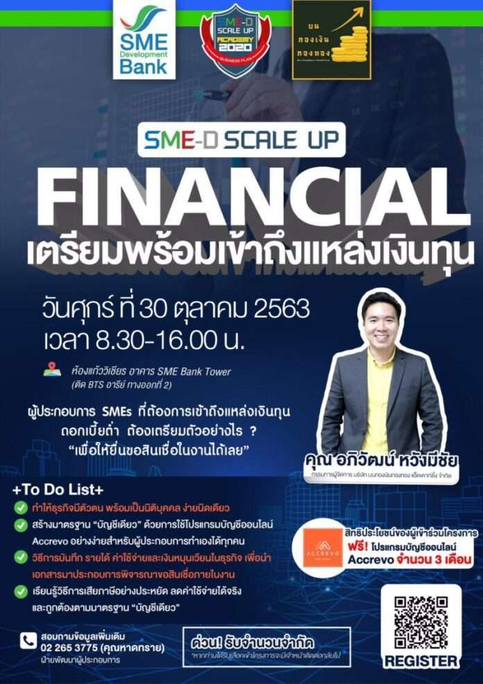 22ต.ค.63/ฝ่ายประชาสัมพันธ์ ธนาคารพัฒนาวิสาหกิจขนาดกลางและขนาดย่อมแห่งประเทศไทย (ธพว.) หรือ SME D Bank แจ้งว่า ร่วมกับบริษัทบนกองเงินกองทอง จำกัด จัดกิจกรรมสนับสนุนผู้ประกอบการเอสเอ็มอีไทยต่อยอดธุรกิจสร้างการเติบโตอย่างแข็งแกร่ง เปิดคลาส “SME D Scale Up Financial เตรียมพร้อมเข้าถึงแหล่งเงินทุน” ในวันศุกร์ที่ 30 ตุลาคม 2563 เวลา 08.30-16.00 น. ณ ห้องแก้ววิเชียร ชั้น 11 สำนักงานใหญ่ SME Bank Tower
