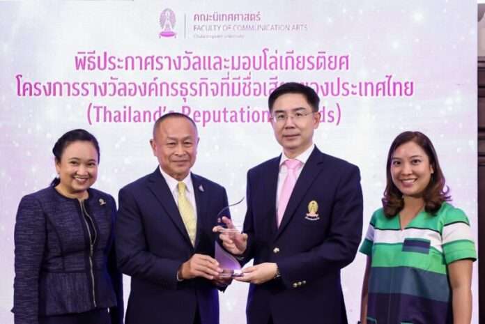 ภายในงานพิธีประกาศรางวัลและมอบโล่เกียรติยศโครงการรางวัลองค์กรธุรกิจที่มีชื่อเสียงของประเทศไทย (Thailand’s Reputation Awards 2019) จัดโดยคณะนิเทศศาสตร์ จุฬาลงกรณ์มหาวิทยาลัย โดยมีศาสตราจารย์ ดร.บัณฑิต เอื้ออาภรณ์ (ที่3 จากซ้าย) อธิการบดีจุฬาลงกรณ์มหาวิทยาลัย เป็นประธานจัดงานพร้อมด้วย ศาตราจารย์ ดร. ปาริชาติ สถาปิตานนท์ (ซ้ายสุด) ผู้ช่วยอธิการบดี จุฬาลงกรณ์มหาวิทยาลัย และ ผู้ช่วยศาสตราจารย์ ธีรดา จงกลรัตนาภรณ์(ขวาสุด) ร่วมแสดงความยินดี ณ อาคารมหาจุฬาลงกรณ์ คณะอักษรศาสตร์ จุฬาลงกรณ์มหาวิทยาลัย เมื่อเร็วๆนี้