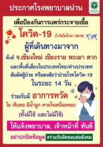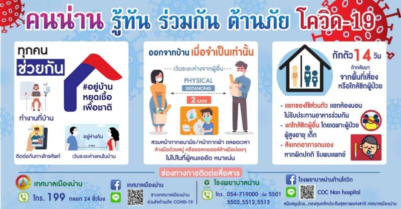 ทั้งนี้ สอบถามข้อมูลโรคโควิด-19 ได้ที่ สำนักงานสาธารณสุขจังหวัดน่าน โทรศัพท์ 084-2128070 / โรงพยาบาลน่าน โทร 054-719000 /สายด่วน 1669 หรือที่สายด่วนกรมควบคุมโรค โทร.1422