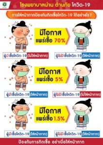 3.เว้นระยะห่างจากบุคคลอื่น อย่างน้อย 1- 2 เมตร 4.หลีกเลี่ยงการเดินทางไปยังพื้นที่ที่มีความเสี่ยง หากจำเป็นจริงๆ ต้องป้องกันตัวเองตามมาตรการข้างต้นอย่างเคร่งครัด 5.เคร่งครัดการใช้แอปพลิเคชัน “ไทยชนะ” เพื่อลงทะเบียนเก็บข้อมูลการเข้าใช้งานพื้นที่สาธารณะ 6.ติดตามข้อมูลข่าวสารจากหน่วยงานที่เชื่อถือได้ เช่น ข่าวจากกระทรวงสาธารณสุข หน่วยงานภาคราชการ สื่อสารมวลชน อย่างต่อเนื่อง ยกเว้นผู้ที่มีความเสี่ยงสูงเท่านั้น / บุคคลทั่วไปที่ไม่มีความเสี่ยง ไม่ได้ไปสถานที่เดียวกัน ในช่วงเวลาเดียวกัน ไม่ได้สัมผัส พูดคุย ถือว่ามีความเสี่ยงต่ำ หรือ ต่ำมาก / ไม่ต้องกักตัว…แต่ มาตรการที่ต้องเข้มข้นทุกคน คือ ใส่หน้ากาก เว้นระยะห่าง และหมั่นล้างมือ… การ์ดอย่าตก