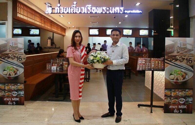 นางสาวชวรมย์ มังคละคีรี (ซ้ายสุด) ผู้อำนวยการฝ่ายผู้เช่าสัมพันธ์ บริษัท พาราไดซ์ พาร์ค จำกัด เป็นตัวแทนศูนย์การค้าเอ็ม บี เค เซ็นเตอร์ มอบกระเช้าดอกไม้แสดงความยินดี