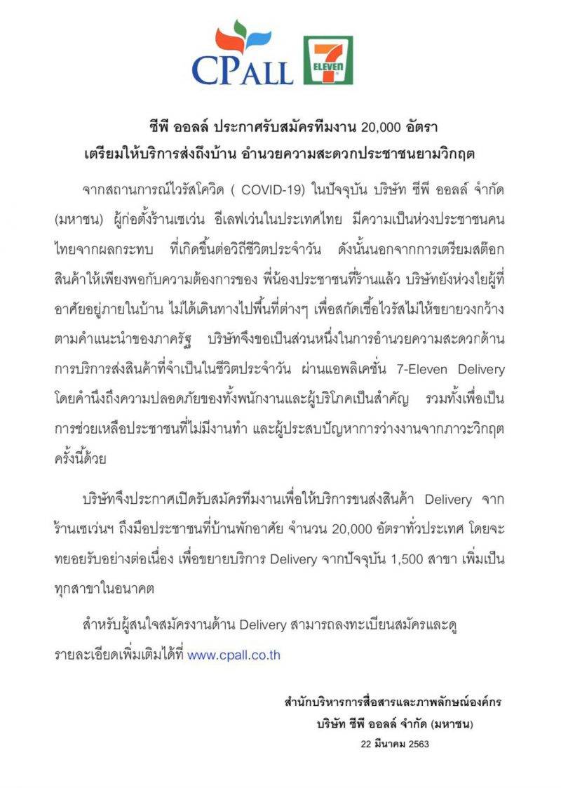 บริษัทจึงประกาศเปิดรับสมัครทีมงานเพื่อให้บริการขนส่งสินค้า Delivery จาก ร้านเซเว่นฯ ถึงมือประชาชนที่บ้านพักอาศัย จำนวน 20,000 อัตราทั่วประเทศ โดยจะทยอยรับอย่างต่อเนื่อง เพื่อขยายบริการ Delivery จากปัจจุบัน 1,500 สาขา เพิ่มเป็นทุกสาขาในอนาคต
