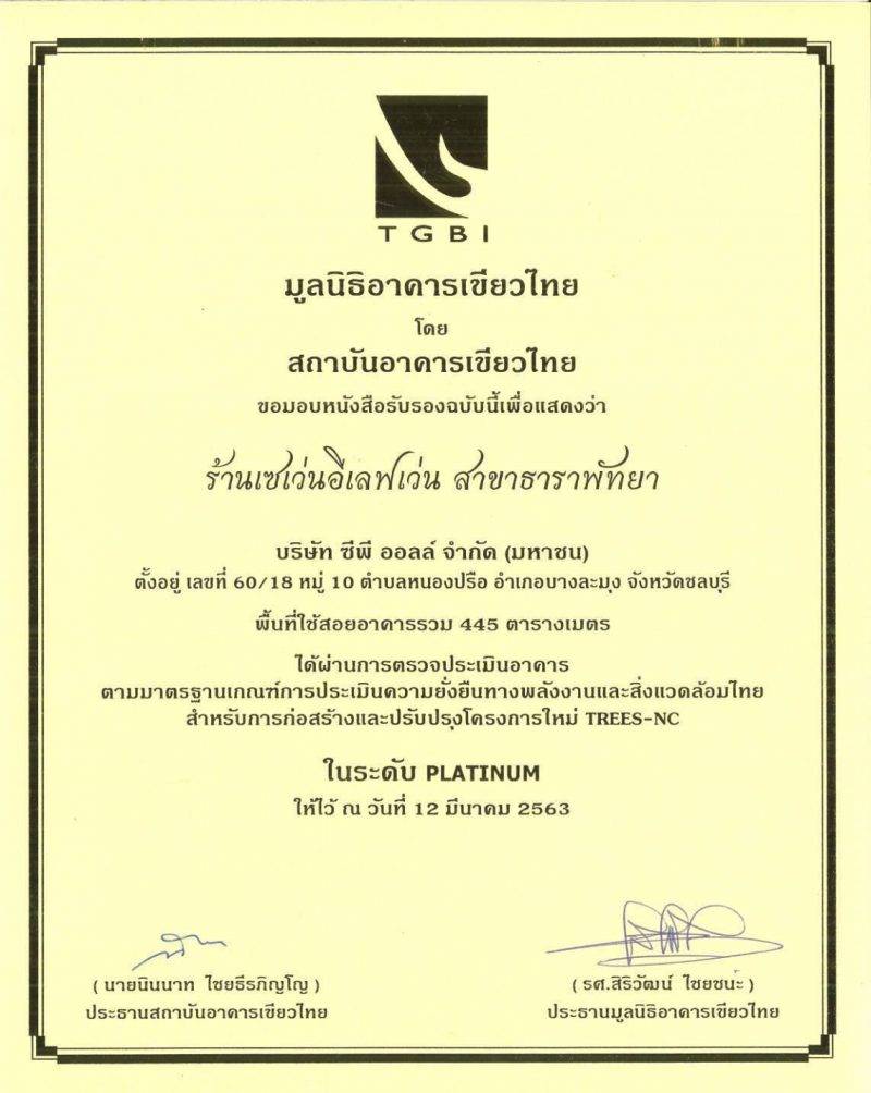 ล่าสุดร้านเซเว่น อีเลฟเว่น สาขาธาราพัทยา จ.ชลบุรี ร้านรูปแบบเรือยอร์ช และเป็นร้าน Flagship Store ของบริษัทฯ ในพื้นที่ภาคตะวันออก ผ่านการรับรองจากสถาบันอาคารเขียวไทยในระดับสูงสุด ‘Platinum’
