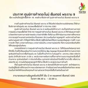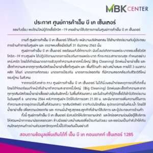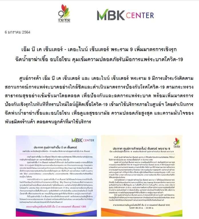 ศูนย์การค้า เอ็ม บี เค เซ็นเตอร์ และ เดอะไนน์ เซ็นเตอร์ พระราม 9 มีการเฝ้าระวังติดตามสถานการณ์การแพร่ระบาดอย่างใกล้ชิดและดำเนินมาตรการป้องกันโรคโควิด-19 ตามกระทรวงสาธารณสุขอย่างเข้มข้นมาโดยตลอด เพื่อป้องกันและลดการแพร่ระบาด พร้อมเพิ่มมาตรการป้องกันเชิงรุกในทันทีที่ทราบไทม์ไลน์ผู้ติดเชื้อโควิด-19 เข้ามาใช้บริการภายในศูนย์ฯ โดยดำเนินการฉีดพ่นน้ำยาฆ่าเชื้อและอบโอโซน เพื่อดูแลสุขอนามัย ความปลอดภัยสูงสุด และความมั่นใจของพันธมิตรร้านค้า ตลอดจนลูกค้าที่มาใช้บริการ