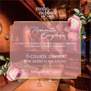 เพื่อให้วันวาเลนไทน์นี้มีความหมายมากยิ่งขึ้นสำหรับคู่รัก มหานคร แบงค็อก สกายบาร์ จัดเมนูพิเศษ “Love at First Bite” นำเสนออาหารค่ำ 3 คอร์ส ที่ประกอบไปด้วย ฟัวกราส์ย่างและเบอร์รี่ เมนล็อบสเตอร์และแฮมอิเบริโกบ่ม 48 เดือน และช็อคโกแลตเค้ก ที่มาพร้อมกับเครื่องดื่ม กุหลาบแดง และอัลบัมภาพที่ระลึกดีไซน์สำหรับวันวาเลนไทน์โดยเฉพาะ โดยเมนูพิเศษดังกล่าวให้บริการเฉพาะวันที่ 13 – 14 กุมภาพันธ์ 2564 ระหว่างเวลา 17:00 – 23:00 น.