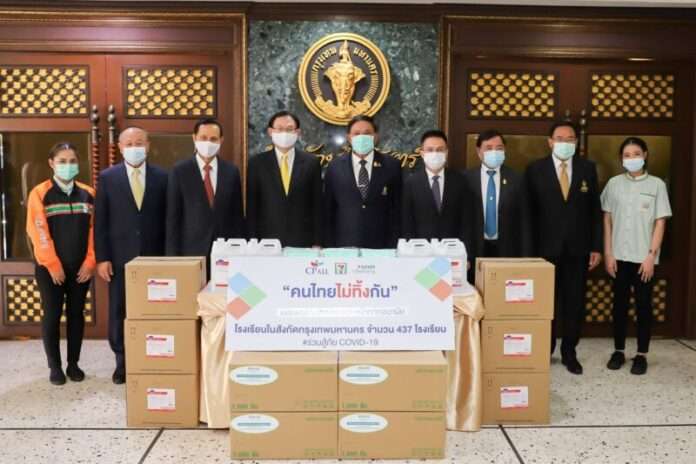4ก.พ.64/ บมจ.ซีพี ออลล์ ผู้บริหารเซเว่น อีเลฟเว่น และ เซเว่น เดลิเวอรี่ เดินหน้าสานต่อโครงการ “คนไทยไม่ทิ้งกัน” มอบเครื่องครุภัณฑ์ทางการแพทย์ ให้กับกรุงเทพมหานคร เพื่อส่งมอบให้กับโรงเรียนในสังกัดกรุงเทพมหานคร และสนับสนุนการทำงานของเจ้าหน้าที่หน่วยงานราชการที่บริการประชาชนป้องกันการแพร่ระบาดของโรคไวรัสโควิด-19 ระลอกใหม่ โดยมี พล.ต.อ. อัศวิน ขวัญเมือง ผู้ว่าราชการกรุงเทพมหานคร รับมอบครุภัณฑ์ทางการแพทย์ แอลกอฮอลล์ทำความสะอาด หน้ากากอนามัย ภายใต้โครงการ “โครงการคนไทยไม่ทิ้งกัน” จากผู้ว่าราชการกรุงเทพมหานคร (ร่วม) บมจ.ซีพี ออลล์ เพื่อส่งมอบให้กับโรงเรียนในสังกัดกรุงเทพมหานครจำนวน 437 แห่ง โดยมีนายสุวิทย์ กิ่งแก้ว ที่ปรึกษาอาวุโสคณะเจ้าหน้าที่บริหาร, นายบัญญัติ คำนูณวัฒน์ ที่ปรึกษาคณะเจ้าหน้าที่บริหาร และผู้แทนผู้บริหาร ร่วมงาน ณ ศาลาว่าการกรุงเทพมหานคร เมื่อเร็วๆนี้