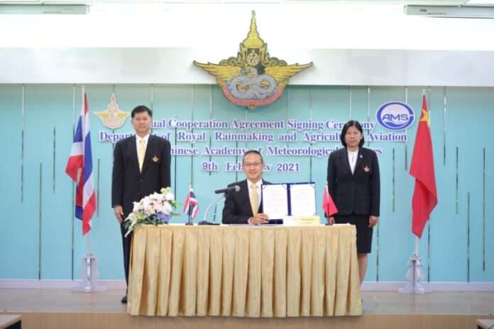 ทั้นนี้ นายสุรสีห์ กิตติมณฑล อธิบดีกรมฝนหลวงและการบินเกษตร กระทรวงเกษตรและสหกรณ์ และ ดร. ต้วน อี้หง (Dr. DUAN Yihong) ผู้อำนวยการสถาบันอุตุนิยมวิทยาศาสตร์ องค์การอุตุนิยมวิทยาแห่งสาธารณรัฐประชาชนจีน ร่วมลงนามบันทึกข้อตกลงทางวิชาการด้านการดัดแปรสภาพอากาศ ผ่านการประชุมเสมือนจริง ซึ่งมีวัตถุประสงค์เพื่อแลกเปลี่ยนประสบการณ์การทำงาน เครื่องมือ เทคโนโลยี และบุคลากร รวมทั้งร่วมกันวิจัยในการเพิ่มประสิทธิภาพการดัดแปรสภาพอากาศ เพื่อบรรเทาความเสียหายจากภัยแล้งและภัยพิบัติทางธรรมชาติ และมีขอบเขตความร่วมมือด้วยการแลกเปลี่ยนความรู้ทางวิชาการและประสบการณ์ด้านการดัดแปรสภาพอากาศ การสร้างเสริมศักยภาพในรูปแบบการศึกษา ฝึกอบรมและวิจัยร่วมกัน ภายใต้กรอบระยะเวลาความร่วมมือ 4 ปี ตั้งแต่วันที่ 9 กุมภาพันธ์ 2564 ถึงวันที่ 8 กุมภาพันธ์ 2568