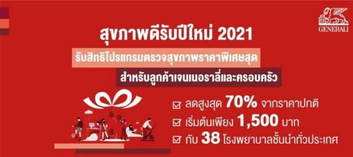 “เจนเนอราลี่” เปิดตัวแคมเปญสุขภาพดีรับปีใหม่ 2021 รับสิทธิ์โปรแกรมตรวจสุขภาพราคาพิเศษสุด สำหรับลูกค้าเจนเนอราลี่และครอบครัว รวมถึงบุคคลที่ห่วงใยรับส่วนลดสูงสุดถึง 70% เริ่มต้นเพียง 1,500 บาท ร่วมกับ 38 โรงพยาบาลชั้นนำทั่วประเทศ ลงทะเบียนรับสิทธิ์ผ่านทางไลน์เจนเนอราลี่ ไทยแลนด์ (LINE Generali Thailand) ตั้งแต่วันนี้ถึง 28 ก.พ. 64