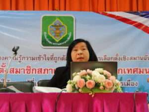 นางสาวสุนัชญา มีชัย หัวหน้างานการมีส่วนร่วม  ได้บรรยายเรื่อง ค่าใช้จ่ายในการเลือกตั้งและการจัดทำบัญชีรายรับและรายจ่ายในการเลือกตั้งของผู้สมัครฯ นางสาว กัณณิกา สายประเสริฐ  หัวหน้างานจัดการเลือกตั้ง บรรยายเรื่องกระบวนการเลือกตั้งสมาชิกเทศบาลและนายกเทศมนตรี พร้อมทั้งเสริมสร้างความรู้ความเข้าใจที่ถูกต้องเกี่ยวกับการเลือกตั้งเชิงสมานฉันท์ในการเลือกตั้งสมาชิกสภาท้องถิ่นและผู้บริหารท้องถิ่น ในหัวข้อกฎหมายที่เกี่ยวข้อง
