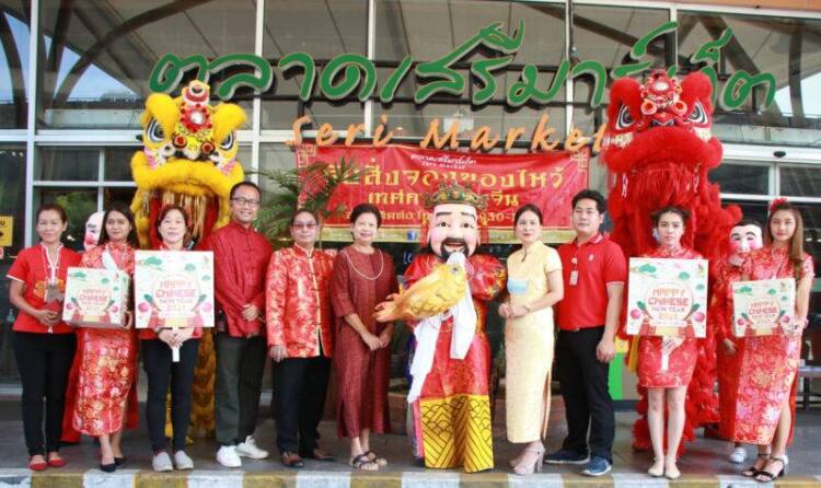 นางสาวจรูญรัตน์ สาลี ผู้จัดการทั่วไป บริษัท เดอะไนน์ เซ็นเตอร์ จำกัด (ที่ 8 จากซ้าย) นำคณะผู้บริหารและพนักงาน ศูนย์การค้า เดอะไนน์ เซ็นเตอร์ พระราม 9 เดินขบวนสิงโตจีนแจกส้มมงคลต้