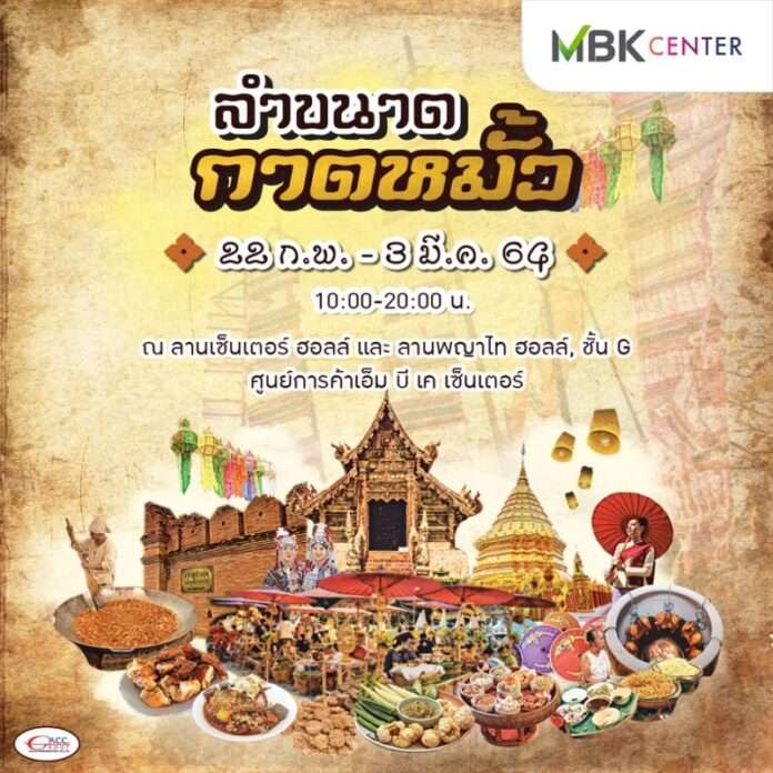 ศูนย์การค้าเอ็ม บี เค เซ็นเตอร์ ร่วมกับACC.Group ชวนสัมผัสเสน่ห์วิถีชีวิตเมืองเหนือแอ่วกาดคนเมืองมาม่วนใจ๋ในงาน “ลำขนาด กาดหมั้ว” ระหว่างวันที่ 22 กุมภาพันธ์ – 3 มีนาคม 2564 ตั้งแต่เวลา 10.00 น. – 20.00 น. บริเวณชั้น G ลานเซ็นเตอร์ ฮอลล์ และลานพญาไท ฮอลล์