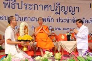 เมื่อวันที่ 21 มี.ค. 64 ที่บริเวณพุทธมณฑลสมโภช 750 ปี ต.บัวสลี อ.แม่ลาว จ.เชียงราย ผศ.ดร.พระรัตนมุนี เจ้าคณะจังหวัดเชียงราย คณะสงฆ์เชียงราย สมาพันธ์ส่งเสริมและพิทักษ์พระพุทธศาสนาเชียงราย จัดกัน”ประกาศปฏิญญา ให้พระพุทธศาสนา เป็นศาสนาหลักประจำจังหวัดเชียงราย โดยมี พุทธศาสนิกชน สภาวัฒนธรรมจังหวัดเชียงราย สมาพันธ์ส่งเสริมและพิทักษ์พระพุทธศาสนาจังหวัดเชียงราย พุทธสมาคมอำเภอ สภาวัฒนธรรมอำเภอทุกอำเภอ และองค์กรเครือข่าย รวมกว่า 7,000 คน แต่งกายด้วยชุดขาวเข้าร่วมกิจกรรม