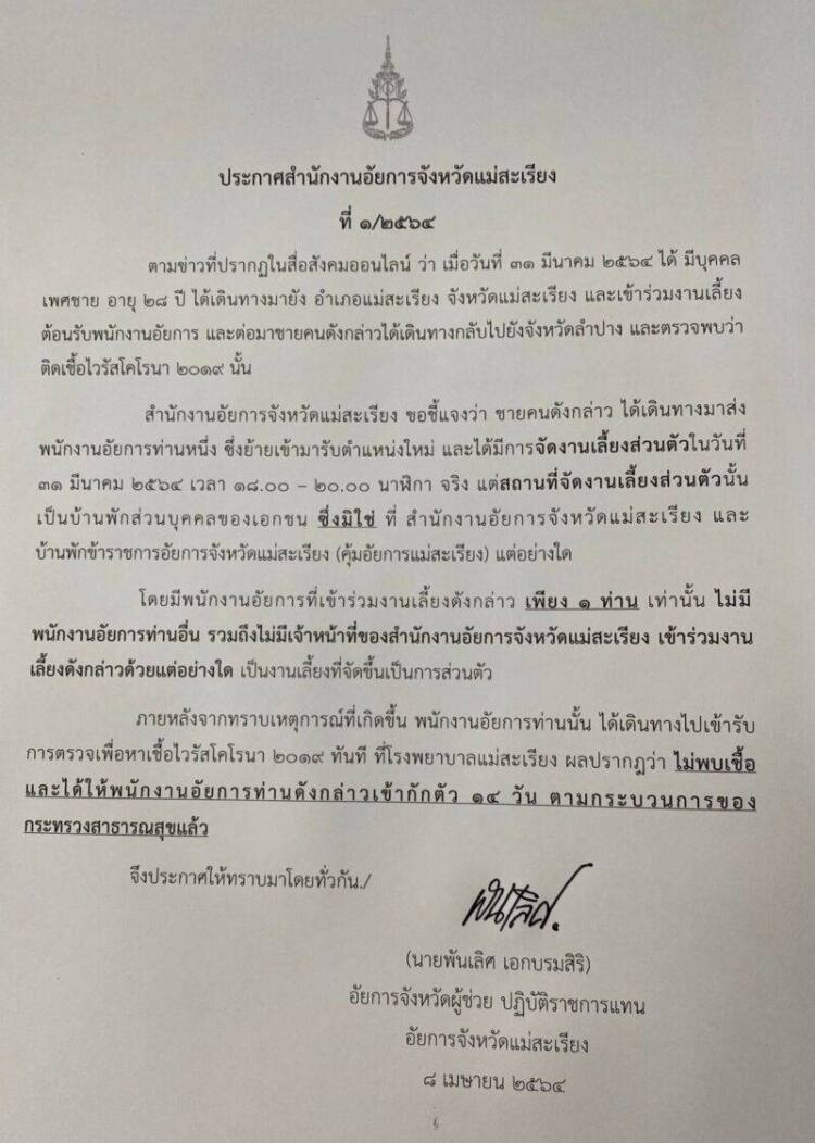8 เม.ย.64 นายพันเลิศ เอกบรมสิริ อัยการจังหวัดผู้ช่วย ปฏิบัติราชการแทน อัยการจังหวัดแม่สะเรียง ออกประกาศสำนักงานอัยการจังหวัดแม่สะเรียง ที่ 1/2564 ว่า ตามข่าวที่ปรากฏในสื่อสังคมออนไลน์ เมื่อวันที่ 31 มีนาคม 2564 ได้ มีบุคคลเพศชาย อายุ 28 ปี ได้เดินทางมายัง อ.แม่สะเรียง จ.แม่ฮ่องสอน และได้เข้าร่วมงานเลี้ยงต้อนรับพนักงานอัยการ และต่อมาชายคนดังกล่าวฯได้เดินทางกลับไปยัง จ.ลำปาง และตรวจพบว่า ติดเชื้อไวรัสโคโรนา 2019 นั้น