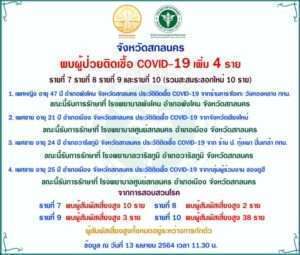 วันที่ 13 เมษายน 2564 สำนักงานสาธารณสุขจังหวัดสกลนคร ได้รายงานผู้ป่วยใหม่แล้ว รวม 10 ราย นอกจากนี้จังหวัดสกลนคร ยังออกมาตรการปิดสถานบันเทิง และห้ามดื่มสุราในสถานบริการ เช่นโรงแรม เนื่องจากช่วงที่ผ่านมาว่าพบจำนวนผู้ติดเชื้อรายใหม่เพิ่มขึ้นอย่างมีนัยสำคัญ และผู้ติดเชื้อได้กระจายตัวออกไปในหลายพื้นที่อย่างรวดเร็ว จากการติดตามและสอบสวนโรคของเจ้าหน้าที่ฝ่ายสาธารณสุขพบว่า การแพร่ระบาดในลักษณะกลุ่มก้อนนี้ ผู้ติดเชื้อหลายรายมีกรณีเชื่อมโยงกับการเข้าใช้บริการของสถานบันเทิงหรือสถานบริการประเภทต่าง ๆ โดยที่มิได้แสดงอาการของโรคและแพร่โรคออกไปยังผู้สัมผัสใกล้ชิด ซึ่งมีข้อมูลว่าเป็นเชื้อโรคสายพันธุ์ที่สามารถระบาดได้รวดเร็วกว่าปกติประกอบกับการเริ่มเข้าสู่ช่วงเทศกาลวันหยุดที่เป็นปัจจัยเสี่ยงเพิ่มขึ้น หากไม่ดำเนินการเข้าควบคุมอาจเกิดการรวมกลุ่มของบุคคลในสถานที่ดังกล่าวโดยละเลยไม่ปฏิบัติตามมาตรการป้องกันโรค