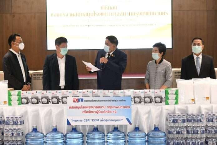 21 เม.ย.64 /พล.ต.อ.อัศวิน ขวัญเมือง ผู้ว่าราชการกรุงเทพมหานคร ประธานพิธีรับมอบสิ่งของจากภาคเอกชนเพื่อสนับสนุนการปฏิบัตงานของโรงพยาบาลสนามกรุงเทพมหานคร ประกอบด้วย ชุด PPE 30 ชุด หน้ากากอนามัยแบบ N95 62 กล่อง หน้ากากอนามัยทางการแพทย์ 20 กล่อง เครื่องทำน้ำร้อน-น้ำเย็น 7 เครื่อง ถังต้มน้ำไฟฟ้า 1 เครื่อง น้ำดื่มบรรจุแกลลอน 7 แกลลอน และน้ำดื่มบรรจุขวด 1,500 ขวด รวมมูลค่า 126,120 บาท จากนายทองชัย ชวลิตพิเชฐ ผู้อำนวยการสำนักงานเศรษฐกิจอุตสาหกรรม และประธานกรรมการกำกับดูแลกิจการที่ดีและความรับผิดชอบต่อสังคม ดร.รักษ์ วรกิจโภคาทร กรรมการผู้จัดการธนาคารเพื่อการส่งออกและนำเข้าแห่งประเทศไทย (Exim Bank)