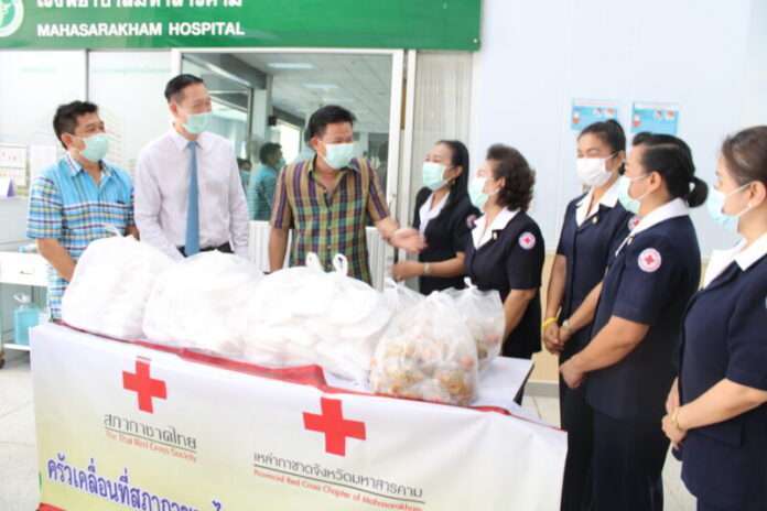 23 เม.ย.2564 นายเกียรติศักดิ์ ตรงศิริ ผู้ว่าราชการจังหวัดมหาสารคาม นางพรศรี ตรงศิริ นายกเหล่ากาชาดจังหวัดฯ พร้อมด้วย คณะกรรมการและสมาชิกเหล่ากาชาดจังหวัดฯ ร่วมกับ บริษัท ฟาร์มมาร์ทโมเดริ์อนเทรด จำกัด ร่วมมอบอาหารจากครัวเคลื่อนที่สภากาชาดไทย ร่วมใจฝ่าวิกฤติ COVID-19 จำนวน 100 ชุด มอบให้แก่บุคลากรทางการแพทย์และผู้ป่วยโควิด-19 ของโรงพยาบาลมหาสารคาม จังหวัดมหาสารคาม โดยมีนายแพทย์ภาคภูมิ มโนสิทธิศักดิ์ ผู้อำนวยการโรงพยาบาลมหาสารคาม พร้อมคณะผู้บริหารร่วมกันรับมอบ ณ โรงพยาบาลมหาสารคาม