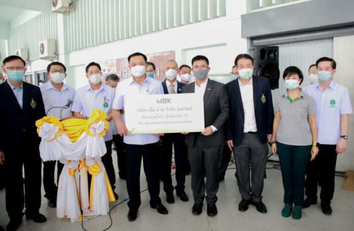 นายวิศาล สิปิยารักษ์ รองกรรมการผู้อำนวยการสายบริหารพื้นที่เช่าและผู้เช่าสัมพันธ์ และรองกรรมการผู้อำนวยการสายการตลาด(ที่ 6 จากซ้าย) พร้อมด้วย นางสาวศตกมล วรกุล ผู้อำนวยการฝ่ายสื่อสารองค์กร บริษัท เอ็ม บี เค จำกัด (มหาชน) (ที่ 8 จากซ้าย) ร่วมมอบน้ำดื่ม MBK บรรจุขวด เบื้องต้น จำนวน 3,000 ขวด ให้กับกระทรวงสาธารณสุข เพื่อส่งต่อให้กับบุคลากรทางการแพทย์ เจ้าหน้าที่ และผู้ป่วยติดเชื้อโควิด-19 ในศูนย์แรกรับและส่งต่อ อาคารกีฬานิมิบุตร สนามกีฬาแห่งชาติ โดยมี นายอนุทิน ชาญวีรกูล รองนายกรัฐมนตรีและรัฐมนตรีว่าการกระทรวงสาธารณสุข (ที่ 4 จากซ้าย) พร้อมด้วย นายพิพัฒน์ รัชกิจประการ รัฐมนตรีว่าการกระทรวงการท่องเที่ยวและกีฬา (ที่ 5 จากซ้าย) นายโชติ ตราชู ปลัดกระทรวงการท่องเที่ยวและกีฬา (ที่ 7 จากซ้าย) ดร.นิวัตน์ ลิ้มสุขนิรันดร์ อธิบดีกรมพลศึกษา (ที่ 1 จากซ้าย) และ นายแพทย์สมศักดิ์ อรรฆศิลป์ อธิบดีกรมการแพทย์ ร่วมรับมอบ ณ กองอำนวยการ ศูนย์แรกรับและส่งต่ออาคารกีฬานิมิบุตร สนามกีฬาแห่งชาติ เมื่อเร็วๆ นี้