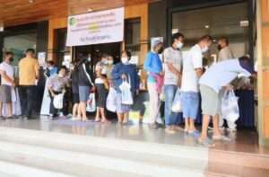 บรรยากาศช่วงเช้าวัน ที่ 6 พ.ค.64 มีที่บริเวณอาคารด้านหน้าศาลากลางจังหวัดมหาสารคาม ประชาชนทั้งผู้สูงอายุ แม่บ้าน เด็ก ได้มาเข้าคิวยืนรออาหารกว่า 300 คน เพื่อมารับของบริจาคในตู้ปันสุข โดยมีพระอธิการสุเนตร กนฺตวีโร เจ้าอาวาสวัดโพธิ์ศรีบ้านลาด ต.ศรีสุข อ.กันทรวิชัย มหาสารคาม ได้นำสิ่งของที่พระภิกษุบิณฑบาต รวมถึงสิ่งของจากสังฆทานของพระภิกษุที่เหลือใช้อยู่แล้ว และสิ่งของในชุมชนจากฐานเรียนรู้เศรษฐกิจพอเพียงภายในหมู่บ้าน นำมาแบ่งปันญาติโยมในยามวิกฤต พร้อมด้วย 4 หน่วยงานหลัก ได้แก่ สนง.วัฒนธรรมจังหวัดมหาสารคาม สนง.พระพุทธศาสนาจังหวัดมหาสารคาม สนง.การท่องเที่ยวและกีฬาจังหวัดมหาสารคาม และ สนง.พลังงานจังหวัดมหาสารคาม ผนึกกำลังนำสิ่งของมาร่วมบริจาคและเติมเติมในตู้ปันสุข ซึ่งจะเป็นการช่วยลดภาระค่าครองชีพในช่วงการแพร่ระบาดของไวรัสโควิด-19 และการขับเคลื่อนเศรษฐกิจที่ยังไม่เข้าสู่ภาวะปกติ ทำให้ประชาชนบางกลุ่มมีรายได้ลดลง เพื่อแบ่งปันให้ผู้ที่เดือดร้อนในแต่ละวันๆ ละ 2 รอบ ในช่วงเช้าและช่วงบ่ายโดยสิ่งของที่นำมาวันนี้ ประกอบด้วย ข้าวหอมมะลิ น้ำตาลทราย บะหมี่กึ่งสำเร็จรูป ไข่ไก่ น้ำปลา น้ำปลาร้า ปลากระป๋อง นมกล่อง ขนม น้ำมันพืช น้ำยาล้างจาน มะม่วง น้ำดื่ม และหน้ากากอนามัย โดยมีความสุขใจแก่ผู้ให้และผู้รับ ในการส่งต่อสะพานบุญแห่งน้ำใจที่ยิ่งใหญ่ในครั้งนี้เพื่อบรรเทาความเดือดร้อนให้กันในช่วง (โควิด-19)
