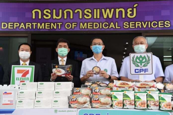 นายประสิทธิ์ บุญดวงประเสริฐ ประธานคณะผู้บริหาร ซีพีเอฟ กล่าวว่า ทีมแพทย์และพยาบาลเป็นผู้เสียสละ เป็นด่านหน้าในการดูแลรักษาผู้ป่วย ซีพีเอฟขอนำความเชี่ยวชาญของบริษัทมาร่วมสนับสนุนการทำงานของทีมแพทย์ โดยนำอาหารสำเร็จรูปพร้อมรับประทานจำนวน 24,000 แพ็ค ภายใต้ “โครงการ CPF ส่งอาหารจากใจ ร่วมต้านภัยโควิด-19” ซึ่งดำเนินการมาตั้งแต่การระบาดรอบแรก มาแบ่งเบาภารกิจการจัดเตรียมอาหารของทีมแพทย์ ในโรงพยาบาลสังกัดกรมการแพทย์ แทนคำขอบคุณและส่งกำลังใจให้ทีมแพทย์และบุคลากรด้านสาธารณสุขทุกท่าน โดยอาหารที่ส่งมอบ ประกอบด้วยอาหารอร่อยหลากหลายเมนู อาทิ เกี๊ยวกุ้ง ข้าวกล้องปลาแพนกาเซียส ดอร์รี่ ข้าวอบธัญพืชและไก่ บะหมี่เป็ดย่างทรงเครื่อง สปาเก็ตตี้คาโบนาร่า ข้าวกะเพราเนื้อสับ เป็นต้น