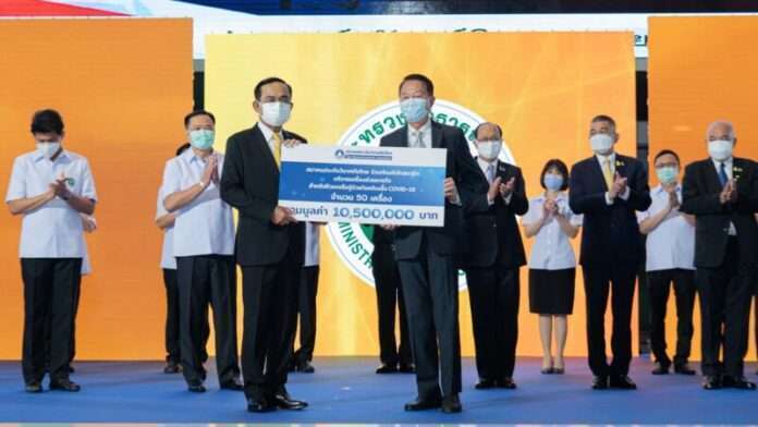 นายอานนท์ วังวสุ นายกสมาคมประกันวินาศภัยไทย ส่งมอบเครื่องช่วยหายใจ จำนวน 50 ชุด รวมมูลค่า 10,500,000 บาท ให้กับโรงพยาบาลบุษราคัม เพื่อใช้ในการดูแลผู้ป่วย COVID-19 ซึ่งสมาคมฯ ร่วมกับบริษัทสมาชิกบริ