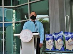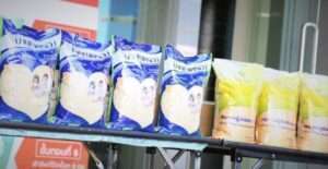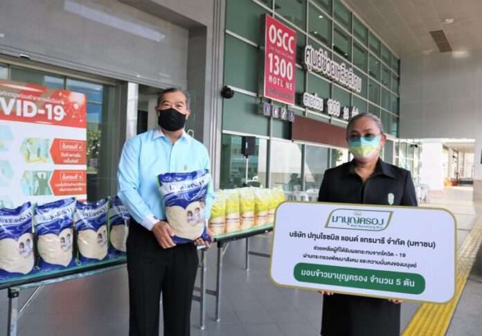 นายสมเกียรติ มรรคยาธร กรรมการผู้จัดการใหญ่ บริษัท ปทุมไรซมิล แอนด์ แกรนารี จำกัด (มหาชน) (ซ้ายสุด) ผู้บริหารกลุ่มธุรกิจในเครือข้าวมาบุญครอง และศูนย์อาหารฟู้ด เลเจ้นด์ส บาย เอ็มบีเค มอบผลิตภัณฑ์ข้าวสารรวงแก้ว จำนวน 5 ตัน ผ่านกระทรวงการพัฒนาสังคมและความมั่นคงของมนุษย์ เพื่อนำไปบรรจุถุงยังชีพช่วยเหลือประชาชนที่ได้รับผลกระทบจากากรแพร่ระบาดของไวรัสโควิด – 19 กว่า 6,000 ครัวเรือน ที่อยู่ในพื้นที่สีแดง 52 เขต ของกรุงเทพมหานคร โดยมี นางสาวแรมรุ้ง วรวัธ รองปลัดกระทรวงการพัฒนาสังคมและความมั่นคงของมนุษย์ (ขวาสุด) ให้เกียรติเป็นผู้แทนในการรับมอบผลิตภัณฑ์ ณ ลานกิจกรรม กระทรวงการพัฒนาสังคมและความมั่นคงของมนุษย์ เมื่อเร็ว ๆ นี้