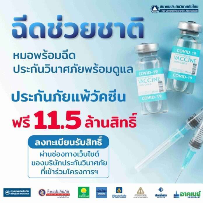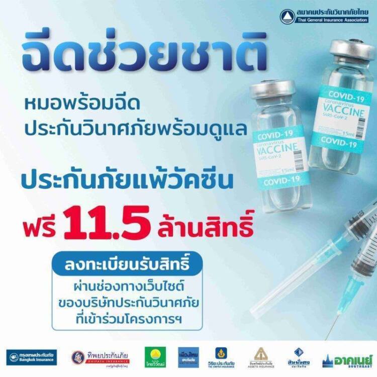 สมาคมประกันวินาศภัยไทย ในฐานะตัวแทนของภาคธุรกิจประกันวินาศภัยไทยที่ส่งเสริมการนำระบบประกันภัยเข้ามาช่วยในการบริหารความเสี่ยงให้กับประชาชนและประเทศชาติ มีความห่วงใยต่อวิกฤติการแพร่ระบาดของเชื้อไวรัส COVID-19 ที่ส่งผลกระทบต่อเศรษฐกิจและสังคม จึงได้ประชุมหารือร่วมกับบริษัทสมาชิกจัดโครงการ “ฉีดช่วยชาติ หมอพร้อมฉีด ประกันวินาศภัยพร้อมดูแล” ขึ้น เพื่อมอบกรมธรรม์ประกันภัยคุ้มครองการแพ้วัคซีนให้กับประชาชนทั่วไปฟรี จำนวน 11.5 ล้านสิทธิ์ เพื่อเป็นการสร้างความมั่นใจและกระตุ้นให้ประชาชนเข้ารับการฉีดวัคซีนป้องกัน COVID-19 กันมากขึ้น
