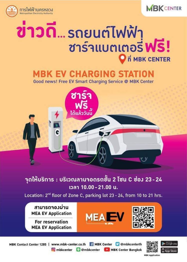 พร้อมเปิดให้บริการแล้ววันนี้ MBK EV Charging Station สถานีอัดประจุไฟฟ้าหรือสถานีชาร์จรถยนต์ไฟฟ้า โดย เอ็ม บี เค เซ็นเตอร์ ศูนย์การค้าของคนไทยหัวใจสีเขียว ร่วมกับ การไฟฟ้านครหลวง หรือ MEA เพื่อส่งเสริมการใช้พลังงานทดแทนที่เป็นมิตรต่อสิ่งแวดล้อม อำนวยความสะดวกให้กับประชาชนผู้ใช้รถยนต์ไฟฟ้า และ ยกระดับการให้บริการลูกค้าสู่บริการอันเป็นเลิศ ณ อาคารจอดรถชั้น 2C เปิดให้บริการจำนวน 3 จุดบริการ/ช่องจอด โดยไม่เสียค่าใช้จ่าย ตั้งแต่เวลา 10.00 น.– 21.00 น. โดยสามารถจองการใช้งานผ่าน MEA EV Application หรือ Walk In สแกนคิวอาร์โค้ดที่หน้าตู้ ณ สถานี MBK EV Charging Station
