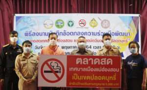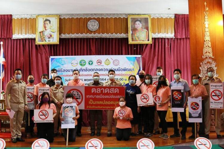 วันที่ 31 พฤษภาคม 2564 นายสิธิชัย จินดาหลวง ผวจ.แม่ฮ่องสอน เป็นประธานการประชุม และร่วมลงนามบันทึกข้อตกลงความร่วมมือ พัฒนาสถานที่สาธารณะปลอดบุหรี่ ประกาศพื้นที่ตลาดปลอดบุหรี่ ลดเสี่ยง ป้องกันโควิด และมอบป้ายตลาดปลอดบุหรี่ เนื่องในวันงดสูบบุหรี่โลก ประจำปี 2564 โดยมี นางอ่อนศรี ศรีอัมพร เครือข่ายสื่อผู้นำรณรงค์เพื่อการไม่สูบบุหรี่ และหน่วยงานที่เกี่ยวข้อง ประกอบด้วย จังหวัดแม่ฮ่องสอน/ เครือข่ายสื่อนักรณรงค์เพื่อการไม่สูบบุหรี่ /สสจ.แม่ฮ่องสอน /ตำรวจภูธรจังหวัดแม่ฮ่องสอน /สำนักงานสรรพสามิตพื้นที่แม่ฮ่องสอน /และสำนักงานเทศบาลเมืองแม่ฮ่องสอน เพื่อแสดงถึงเจตนารมณ์อันมุ่งมั่น ด้วยความตั้งใจร่วมกันพัฒนาดำเนินการขยายผลเฝ้าระวังป้องกันและแก้ไขปัญหาการสูบบุหรี่ คุ้มครองสุขภาพประชากรทุกกลุ่มอายุให้ครอบคลุมทั้งจังหวัด ฯ มีหัวหน้าส่วนราชการ เครือข่ายคณะทำงาน และมูลนิธิรณรงค์เพื่อการไม่สูบบุหรี่ ที่สนับสนุนการดำเนินการ และสื่อมวลชน ร่วมเป็นสักขีพยานในครั้งนี้ ณ ห้องประชุมสภาเทศบาลเมืองแม่ฮ่องสอน