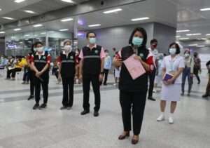 – จุดที่ 1 การเข้ารับบริการ มีพื้นที่รองรับประชาชนรวม 1.4 พันที่นั่ง เป็นกระบวนการเริ่มต้นคัดกรอง วัดไข้ ล้างมือ ชั่งน้ำหนัก วัดความดัน