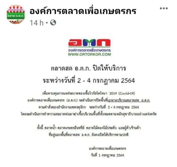 เมื่อวันที่ 2 ก.ค.64 ผู้สื่อข่าวรายงานว่า เพจ องค์การตลาดเพื่อเกษตรกร หรือ อตก.ได้ โพสต์ประกาศปิดให้บริการ ระหว่างวันที่ 2-4 กรกฎาคม เฉพาะพื้นที่บริเวณตลาดสด อตก. ตามคำสั่งของสำนักงานเขตจตุจักร เพื่อพ่นยาฆ่าเชื้อไวรัสโควิด19 ตามหลักสุขาภิบาล ภายหลังจากมีรายงานว่า ผู้ค้าในตลาด อตก.ติดเชื้อไวรัส โควิด 19