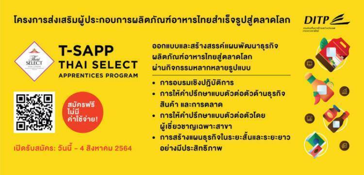 ตามนโยบายของรองนายกรัฐมนตรี และรัฐมนตรีว่าการกระทรวงพาณิชย์ (นายจุรินทร์ ลักษณวิศิษฏ์) ในเรื่องของแผนงาน “อาหารไทย อาหารโลก” ที่มุ่งเน้นการขยายตลาดอาหารไทยไปตลาดโลก กรมส่งเสริมการค้าระหว่างประเทศ หรือ DITP กระทรวงพาณิชย์ จึงได้จัด โครงการส่งเสริมผู้ประกอบการผลิตภัณฑ์อาหารไทยสำเร็จรูปสู่ตลาดโลก และขอเชิญชวนผู้ประกอบการผลิตภัณฑ์อาหารไทยสำเร็จรูปที่มีมีตราสินค้าหรือแบรนด์ (Brand) เป็นของตนเองและมีการจำหน่ายในเชิงพาณิชย์แล้ว เข้าร่วมอบรมแบบไม่เสียค่าใช้จ่าย พร้อมเปิดโอกาสให้ได้ยื่นขอรับตราสัญลักษณ์ Thai SELECT (ไทย ซีเล็คท์) เพื่อเพิ่มศักยภาพและความสามารถทางการแข่งขันในตลาดต่างประเทศ เกิดการต่อยอดแนวคิดและสร้างสรรค์ผลิตภัณฑ์ใหม่ๆ และสร้างเครือข่ายพันธมิตรทางการค้า