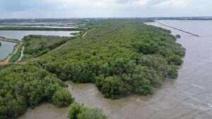 ผืนป่าชายเลน ในพื้นที่ตำบลบางหญ้าแพรก จังหวัดสมุทรสาคร บริเวณอ่าวไทย รูปตัว ก. เป็นพื้นที่ที่เคยมีปัญหาการกัดเซาะชายฝั่ง แต่ในวันนี้… ต้นแสมขาว แสมทะเล ขึ้นเป็นแนวหนาแน่นช่วยป้องกันการกัดเซาะชายฝั่ง กลายเป็นทั้งแหล่งอนุบาลสัตว์ทะเลวัยอ่อน เป็นแหล่งอาหารที่อุดมสมบูรณ์ และแหล่งรายได้ของชุมชนที่ทำอาชีพประมงพื้นบ้าน แปรรูปอาหารจากทะเล ซึ่งเป็นอาชีพดั้งเดิมของคนในพื้นที่