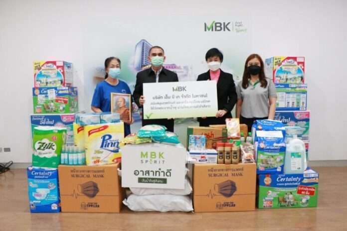 นางสาวศตกมล วรกุล ผู้อำนวยการฝ่ายสื่อสารองค์กร บริษัท เอ็ม บี เค จำกัด (มหาชน) (ที่ 3 จากซ้าย) ร่วมส่งมอบเครื่องอุปโภค-บริโภค และเวชภัณฑ์จำเป็นที่ได้รับบริจาค จากลูกค้า ผู้ประกอบการ และพนักงาน ศูนย์การค้าเอ็ม บี เคเซ็นเตอร์ ในกิจกรรม MBK SPIRIT อาสาทำดี ปันน้ำใจสู่สังคม ให้แก่ นายสุรศักดิ์ พึ่งธรรม ประธานโครงการหัวใจ สีขาว รวมใจรณรงค์ต้านภัยเอดส์ (ที่ 2 จากซ้าย) เพื่อนำไปช่วยเหลือผู้ป่วยติดเชื้อเอชไอวี (HIV) ที่ได้รับผลกระทบจากการแพร่ระบาดของ โควิด –19 ภายในวัดพระบาทน้ำพุ จ.ลพบุรี โดยมีการรับมอบอย่างเป็นทางการ บริเวณ ศูนย์การค้า เอ็ม บี เค เซ็นเตอร์ เมื่อวันก่อน