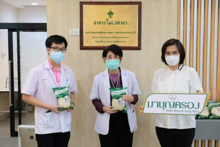 นางสาวมัลลิกา บุระขันธ์ ผู้อำนวยการฝ่ายสื่อสารการตลาด บริษัท พี อาร์ จี คอร์ปอเรชั่น จำกัด (มหาชน) (ที่ 3 จากซ้าย) ผู้ดำเนินธุรกิจใน เครือข้าวมาบุญครอง มอบผลิตภัณฑ์ข้าวหอมมะลิ 100% และน้ำดื่มคูลพลัส ผลิตภัณฑ์จากข้าวมาบุญครอง เพื่อนำไปจัดทำถุงกักตัว (Home Isolation Bag) ภายในถุงประกอบด้วยของยังชีพ และผลิตภัณฑ์บำรุงสุขภาพ เพื่อมอบให้แก่บุคลากรจุ