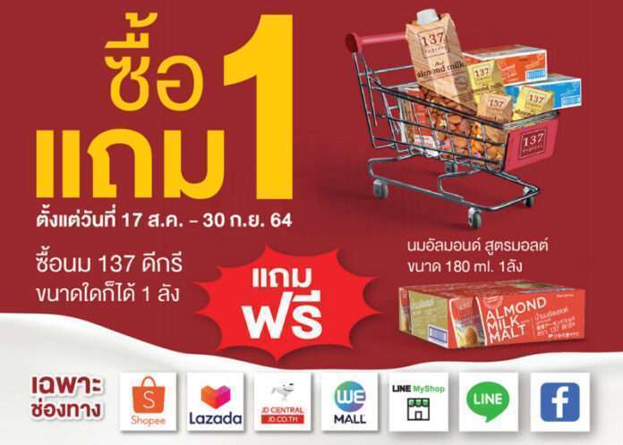 ซิมเพิ้ล ฟู้ดส์ จัดโปรโมชั่นซื้อนมแบรนด์ 137ดีกรี รสชาติใด ขนาดใดก็ได้ รับนมอัลมอนด์สูตรมอลต์ ขนาด 180 มลจำนวน ลัง ฟรี เมื่อสั่งผ่านช่องทางออนไลน์ อาทิ Facebook , Line ,Line My Shop, Shopee , Lazada , JD Central และ Wemall  ตั้งแต่วันที่ 17 สิงหาคม  – 30  กันยายน 2564 หรือจนกว่าสินค้าร่วมรายการจะหมด สอบถามข้อมูลเพิ่มเติมที่ Line @137degrees (มีเครื่องหมาย@)  หรือ Inbox Facebook 137degrees