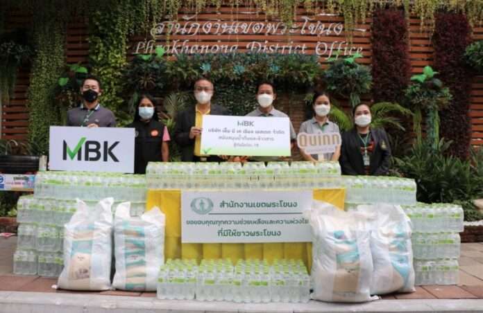 นายสุริยา จันทร์ตระกูล (ที่ 4 จากซ้าย) ผู้อำนวยอาวุโสฝ่ายกฎหมาย บริษัท เอ็ม บี เค เรียล เอสเตท จำกัด ผู้บริหารโครงการควินน์ สุขุมวิท 101 มอบน้ำดื่ม MBK และข้าวสารมาบุญครอง เพื่อสนับสนุนการทำงานของบุ