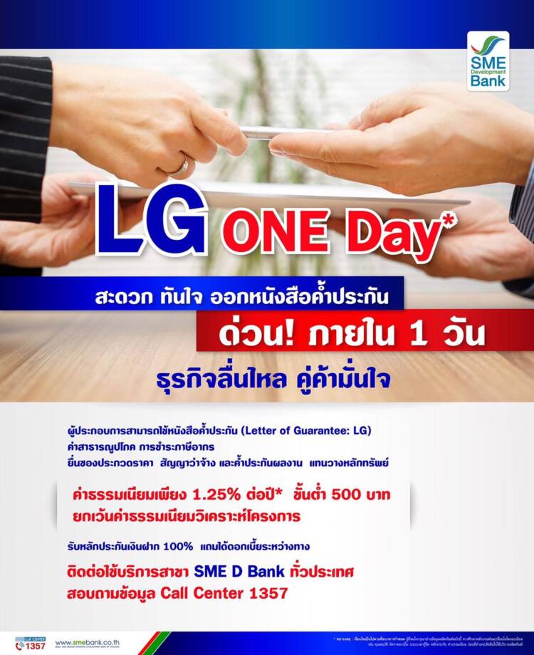SME D Bank เปิดบริการ ‘LG ONE Day’ ออกหนังสือค้ำประกัน ทันใจใน 1 วัน แถมฟรีค่าวิเคราะห์โครงการ พร้อมรับดอกเบี้ยเงินฝากระหว่างทาง ช่วยธุรกิจลื่นไหล คู่ค้ามั่นใจ